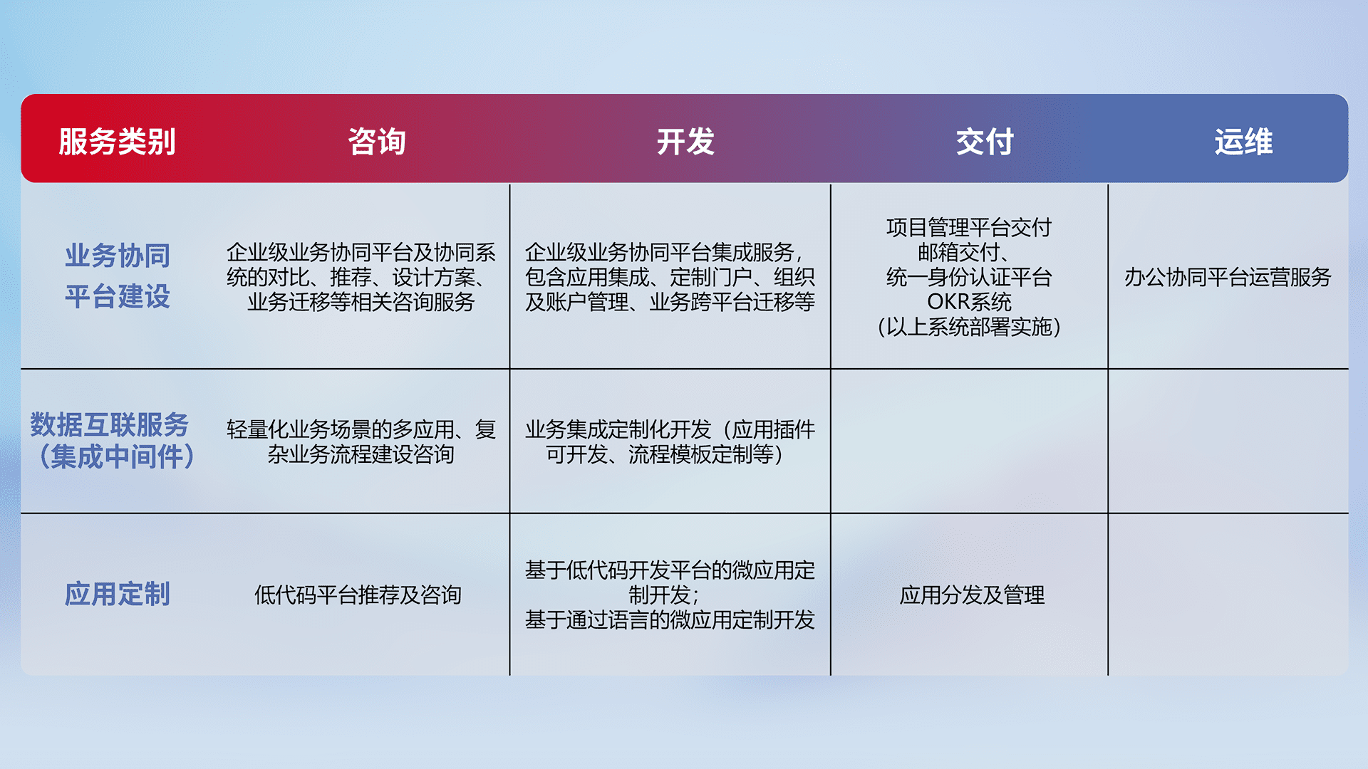 针对钉钉、、企微、、IDaas等平台级产品提供产品的规划、、、方案、、、交付、、、、定制化开发等服务,,实现如统一协同办公、、、智能客户服务、、、、混合会议管理、、、、智能数据查询、、等业务场景,,,,实现数字化转型。。。
